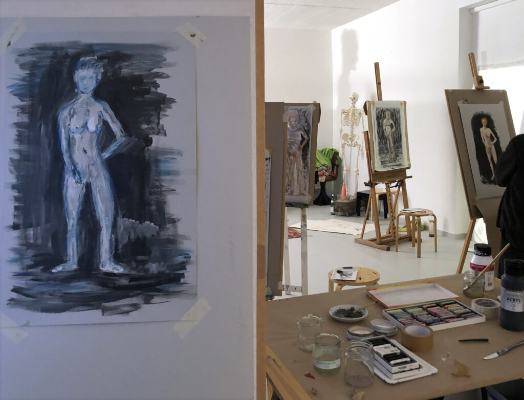 In den Akt-Kursen wird samstags vor dem weiblichen Modell gezeichnet und sonntags werden die Blätter malerisch umgesetzt. Sie lernen, das Auge und die Hand zusammenzuführen.